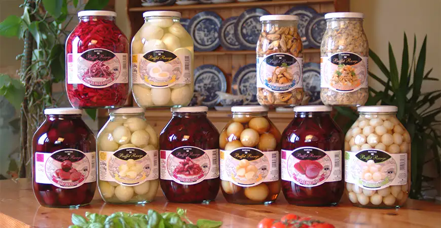 Besides producing smaller packs of pickles for use in the home the company also produces a range of pickles especially for use by the caterer, all of these products having been produced to the same high standards. Because of the seasonality of onions and beetroot in particular the production and the laying down of stocks of these products is always done at the peak of the season so that only the best quality product is used. Products which are available in catering sizes are as follows: